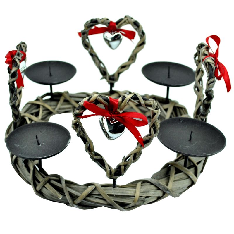 Svietnik - veniec adventný na 4 sviečky je kombinovaný s kovom, prútim a ozdobnou stužkou. Jeho zaujímavý tvar je vhodný do moderného interiéru, zároveň však aj do interiéru v štýle vintage.