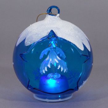 Sklenená guľa so stromčekom vo vnútri a led farebnou diódou je vhodná dekorácia na zavesenie napr.na vianočný stromček poprípade na postavenie na stôl.Napájanie diódy je pomocou 3 gombíkových batérii,ktoré sú sučasťou dodávky.