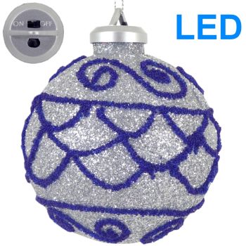 Plastová guľa s trblietkami na povrchu a led diódou je vhodná dekorácia na zavesenie napr.na vianočný stromček.Napájanie diódy je pomocou 3 gombíkových batérii,ktoré sú sučasťou dodávky.