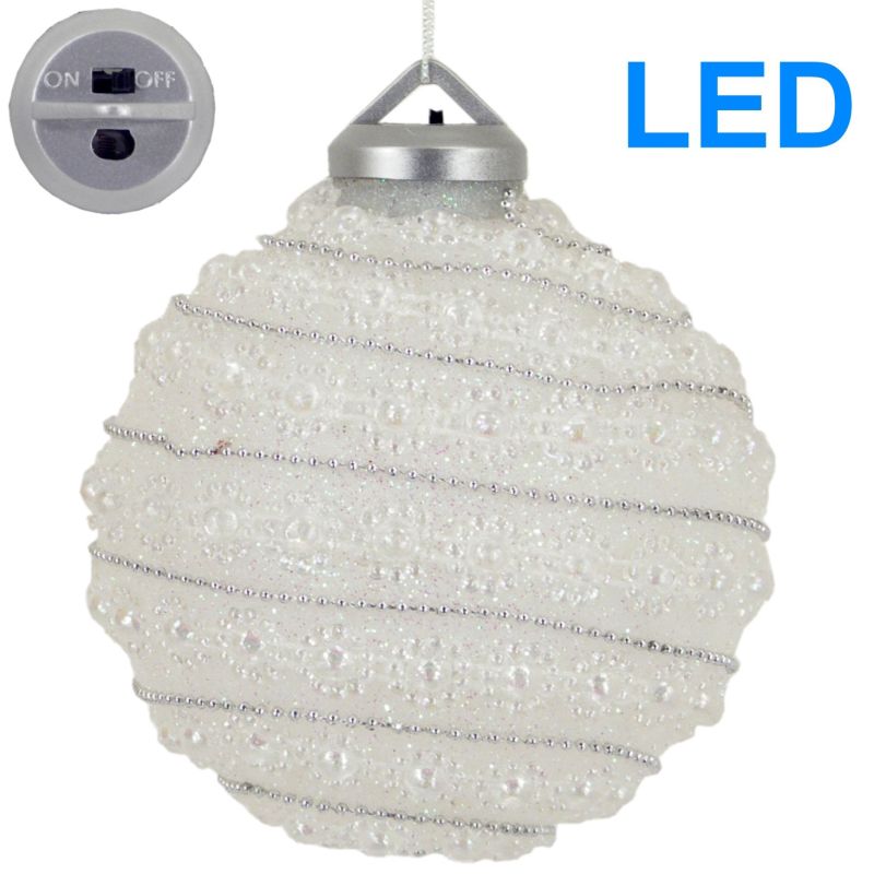 Plastová guľa s trblietkami na povrchu a led diódou je vhodná dekorácia na zavesenie napr.na vianočný stromček.Napájanie diódy je pomocou 3 gombíkových batérii,ktoré sú sučasťou dodávky.