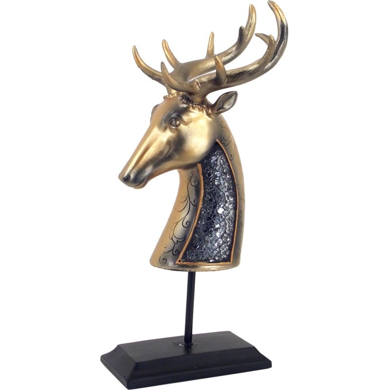 Interiérová dekorácia v podobe hlavy jeleňa na podstavci.