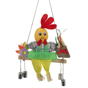 Látkový kohút vo farebnom oblečení sediaci na hojdačke.