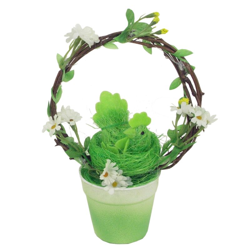 Sisalová sliepka s vajíčkami v kvetináči vystlanom sisalom.Obohatené prúteným oblúkom,listami a kvetmi.