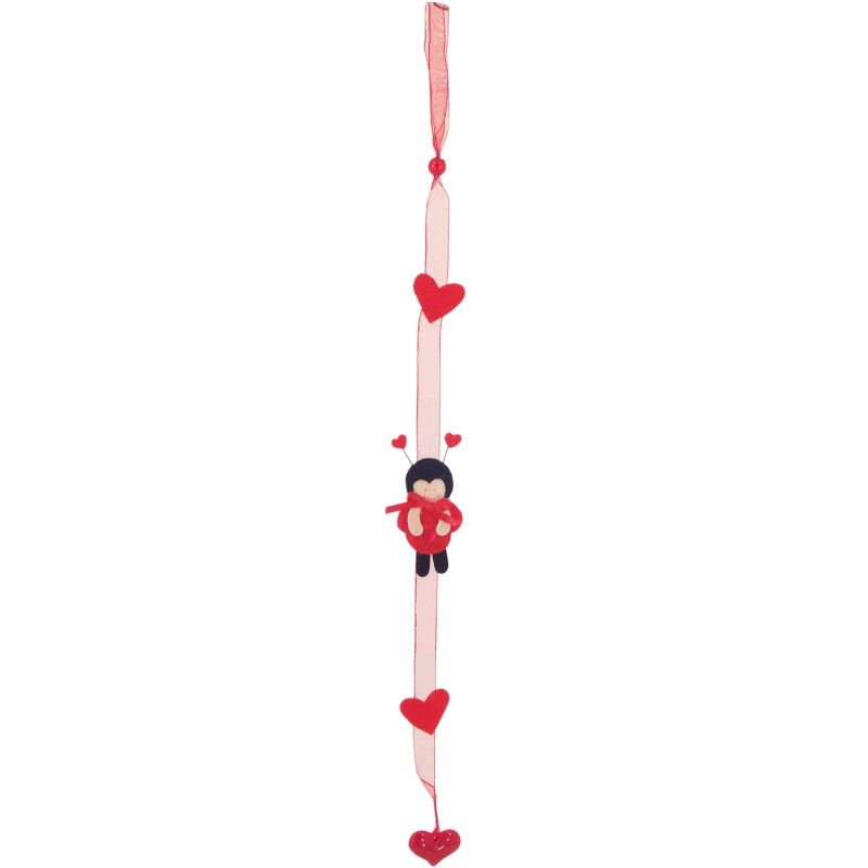 Látkové srdiečka a lienka nalepené na červenej stuhe.