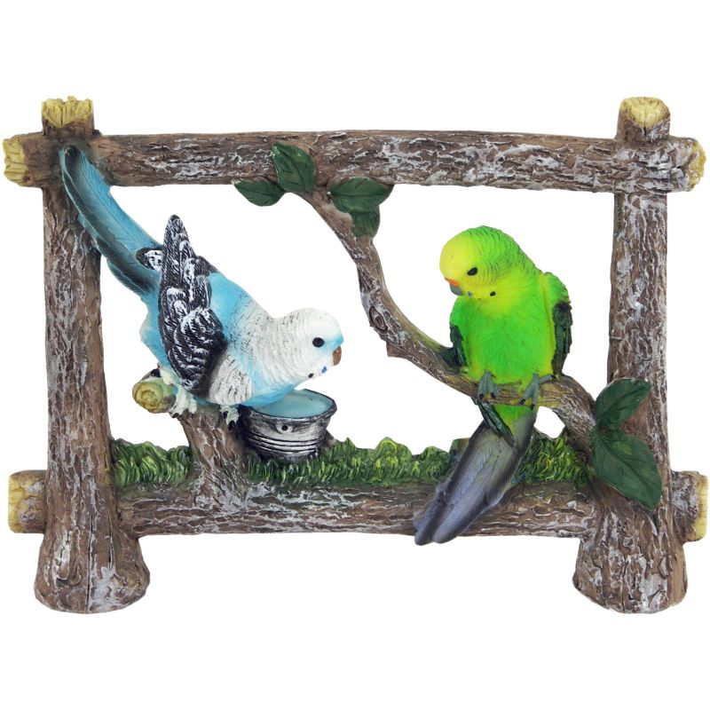 Soška páru papagájov v rámiku pre milovníkov týchto exotických vtákov. Vhodný doplnok do interiéru na poličku a podobne.