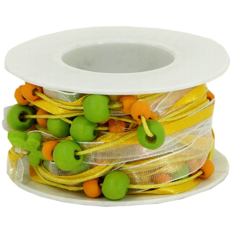 Farebná stuha na cievke doplnená drevenými korálkami.