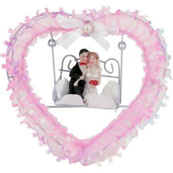 Interiérová dekorácia svadobného páru na hojdačke v srdiečku vjodná v deň svadby.