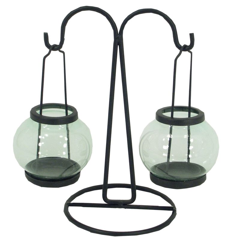Kovový stojan s dvoma čírymi sklenenými svietnikmi. Vhodné ako interiérová dekorácia.
