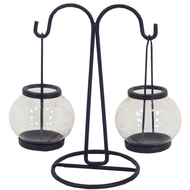 Kovový stojan s dvoma čírymi sklenenými svietnikmi. Vhodné ako interiérová dekorácia.