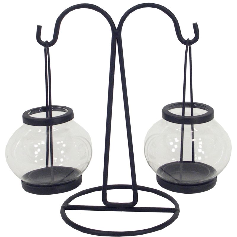 Kovový stojan s dvoma čírymi sklenenými svietnikmi. Vhodné ako interiérová dekorácia.
